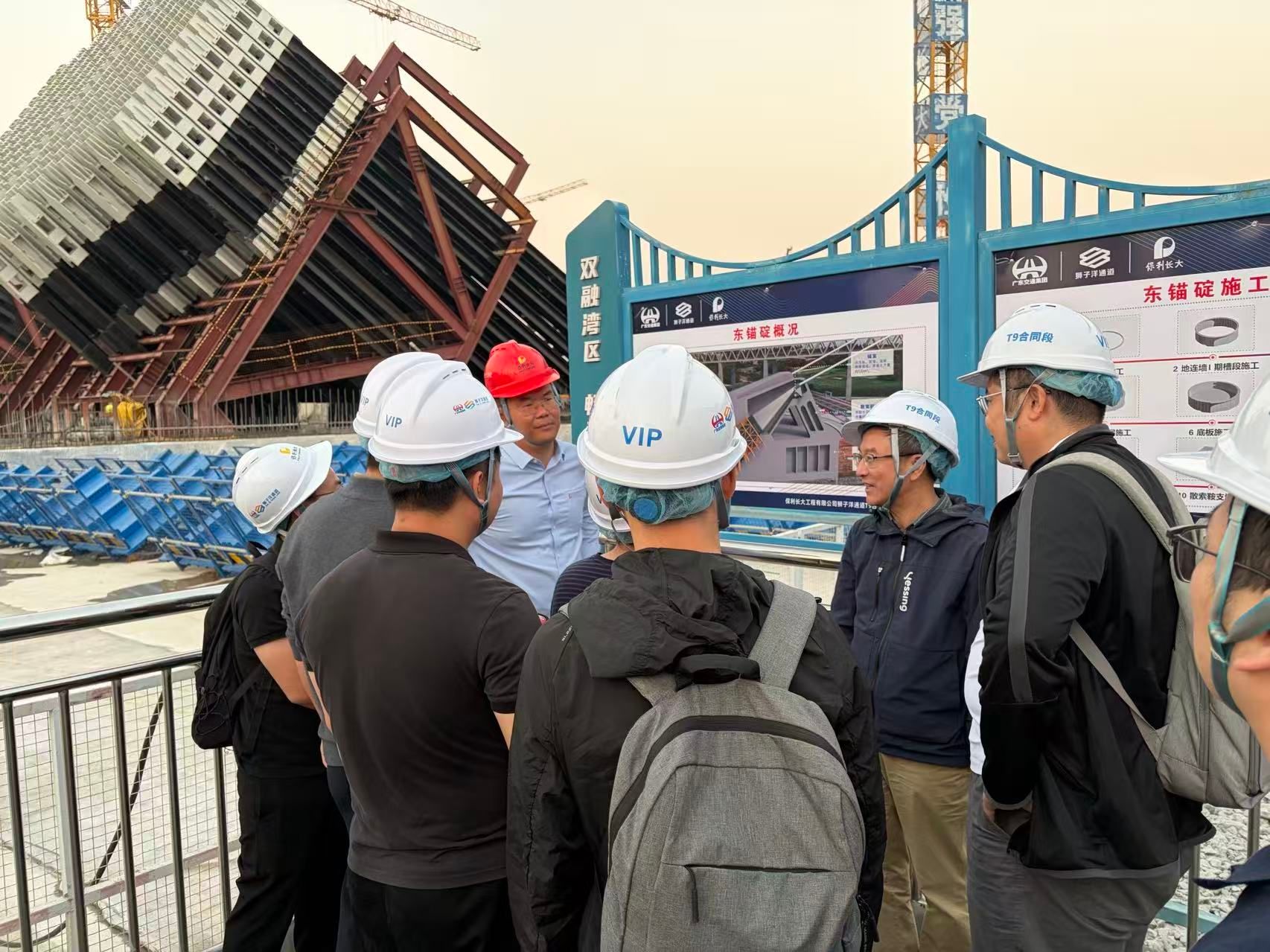 在狮子洋大桥东锚碇施工现场,教师们围绕锚碇深基坑支护、钢箱梁智能制造等技术与项目人员展开交流。实验室党支部教师特别结合城市安全防灾研究方向,探讨了跨海通道在应急疏散、抗震抗风设计中的创新实践。