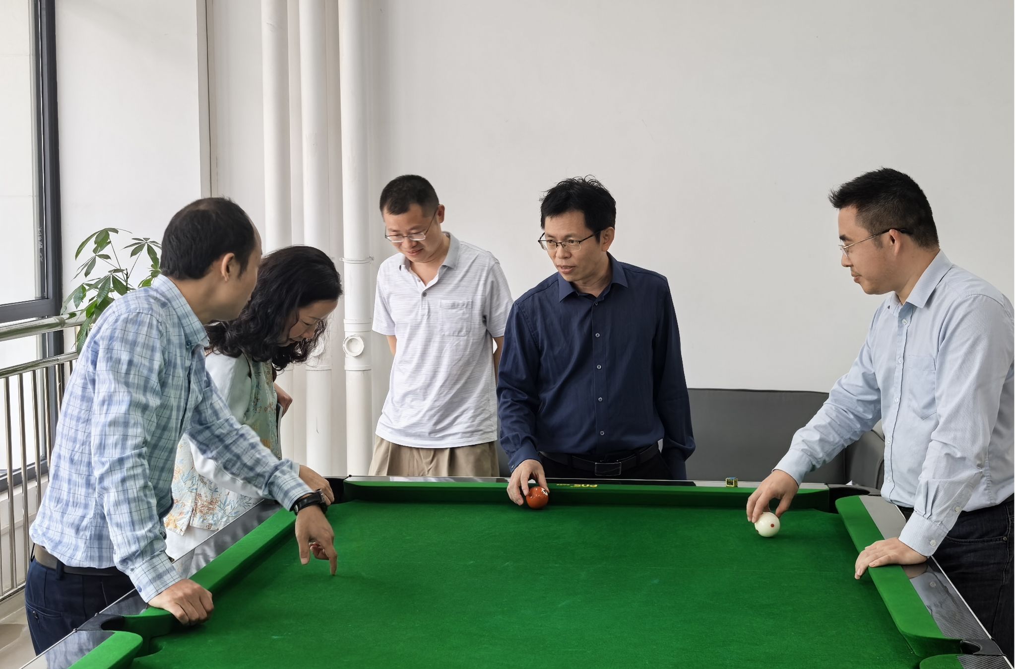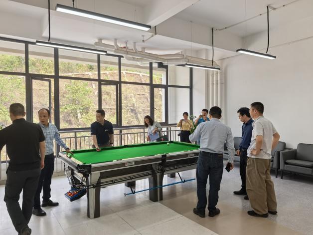 交流结束后,学院拓岗小组还参观了企业休息娱乐室,郭栋副总经理介绍,台球面板是自己公司生产的产品,做到生产应用与检验实践双结合。